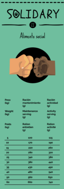 - Afin de minimiser le coût d'une possession responsable d'un chien, de réduire les risques d'abandon d'animaux et d'éviter des changements d'alimentation qui pourraient mettre en danger la santé de nos animaux de compagnie, nous proposons deux recettes pour répondre aux besoins des chiens chiots et adultes : SOLIDARY 26 et SOLIDARY 22 Fabriqué avec les mêmes ingrédients que dans le reste de nos produits pour chiens, mais en limitant la complexité des recettes afin de maintenir un prix social qui aide les personnes qui partagent leur vie avec des chiens, et qui traversent des moments difficiles, à pouvoir continuer à opter pour une alimentation à base d'ingrédients naturels.